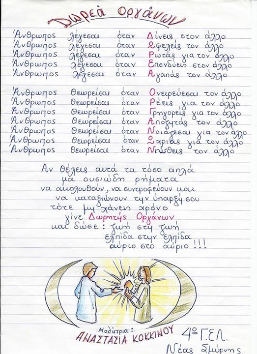 Ήρθε η πρώτη δημιουργία από τη μαθήτρια Αναστασία Κοκκίνου του 4ου Γενικού Λυκείου Νέας Σμύρνης με αφορμή την «Πανελλαδική Εκστρατεία Ενημέρωσης - Δωρεά Οργάνων – Μεταμοσχεύσεις» που διοργανώνει η «ηλιαχτίδα» στην αρχή στη Περιφέρεια Αττικής, και κατόπιν στην υπόλοιπη Ελλάδα.