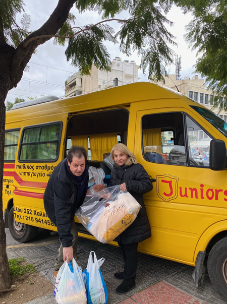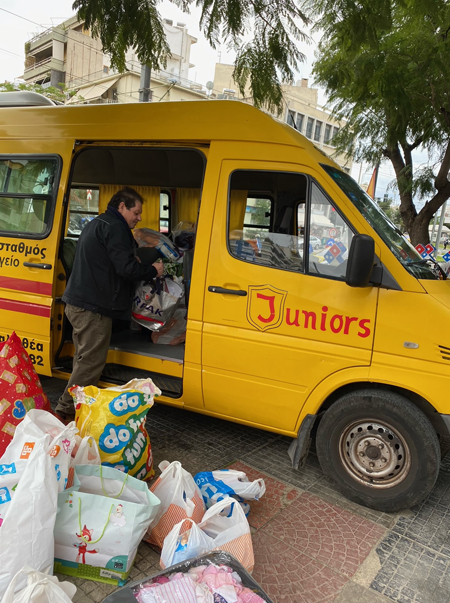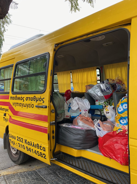 Ένα μεγάλο σχολικό, φορτωμένο με ό,τι μπορεί κανείς να φανταστεί…τρόφιμα, ρούχα, παιχνίδια, απορρυπαντικά, παπούτσια… παρκάρισε στον χώρο στάθμευσης του Συλλόγου «ηλιαχτίδα»- Νέα Σμύρνη.