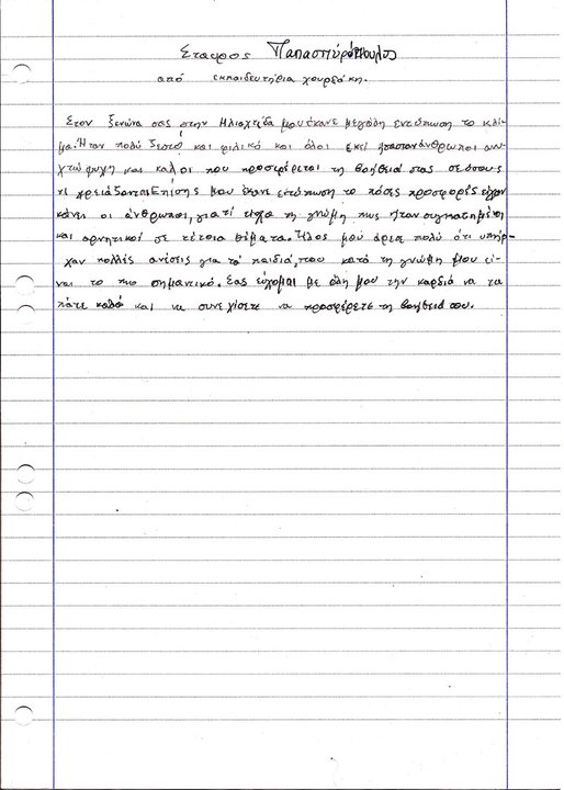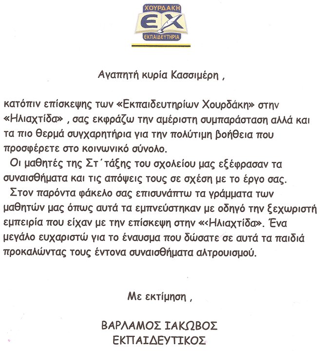 Θα δημοσιεύσουμε ένα φάκελο με τις επιστολές των παιδιών από τα Εκπαιδευτήρια «Χουρδάκη» και την επιστολή του Υποδιευθυντή κ. Βαρλάμου Ιακώβου, μετά την επίσκεψή τους στο Κέντρο Φιλοξενίας Άρρωστου Παιδιού και Οικογένειας «ηλιαχτίδα».
